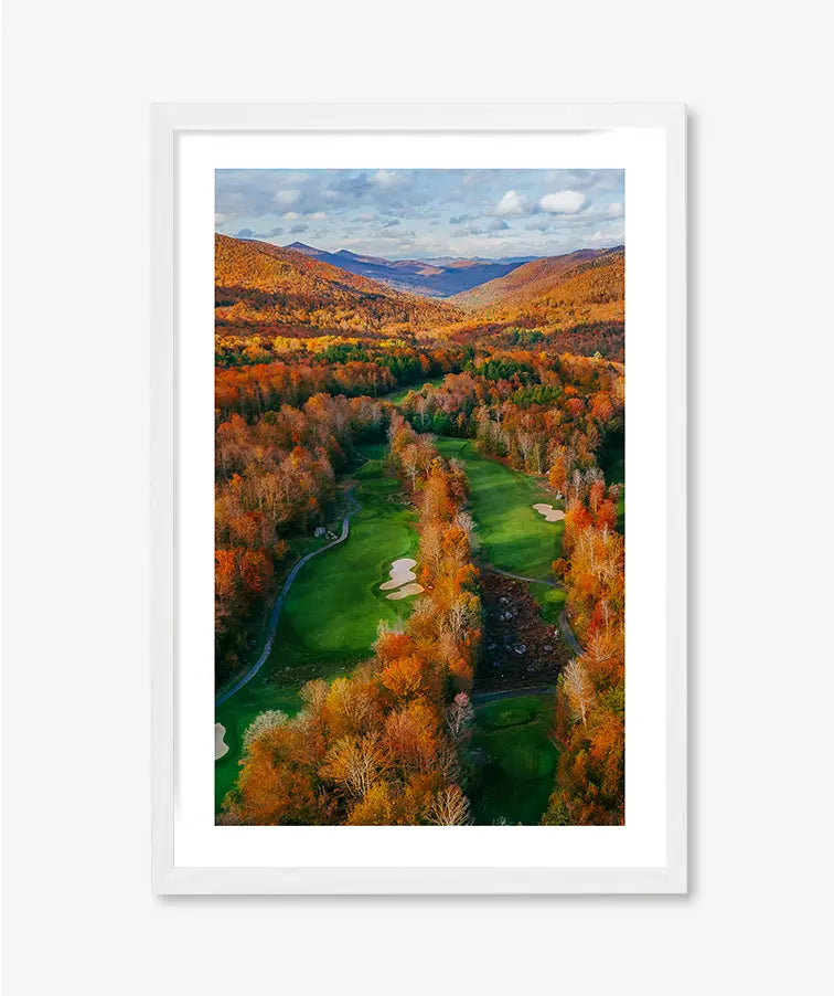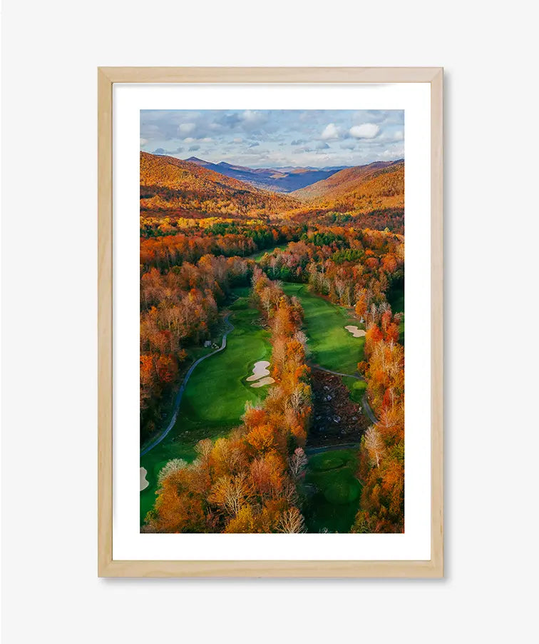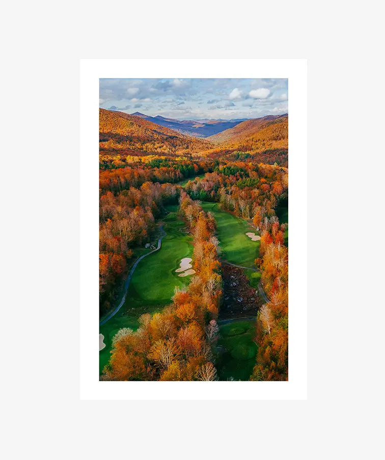 Framed by a blaze of amber, gold, and rust, Amber Corridor captures the drama of fall at full peak. The aerial perspective transforms a winding fairway into a natural passage, where shifting leaves create a striking balance between movement and stillness.