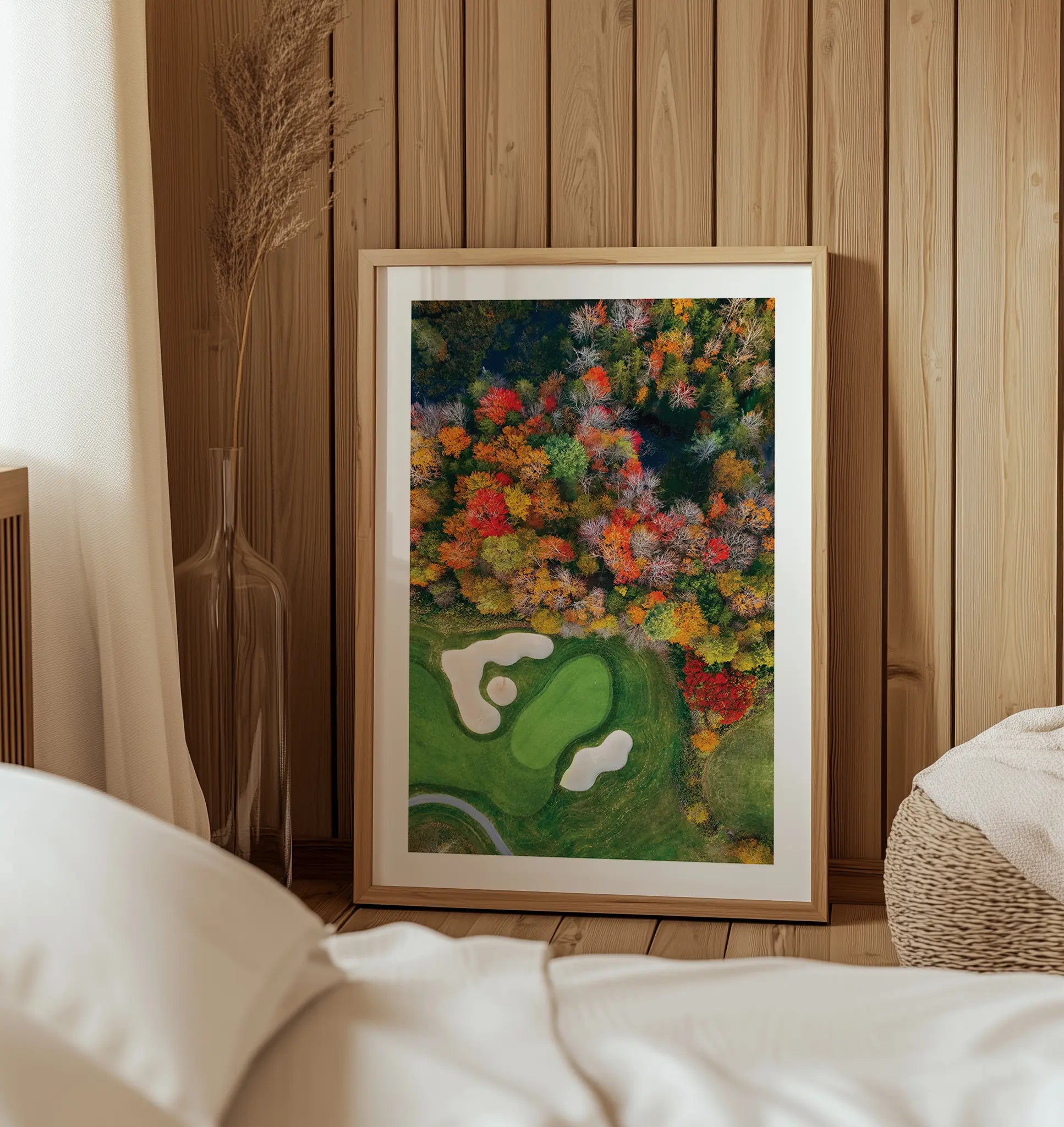 With its patchwork of fiery reds, oranges, and greens, Fire + Grass captures the changing rhythm of the season at its peak. The aerial composition turns a classic green into a canvas of autumn’s brilliance—where golf meets gallery.