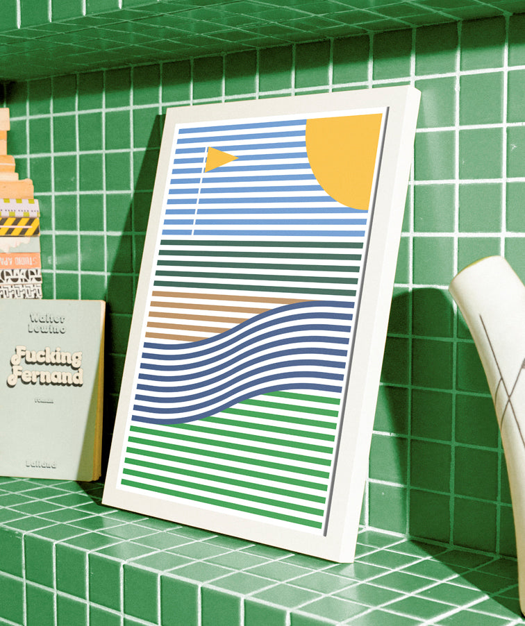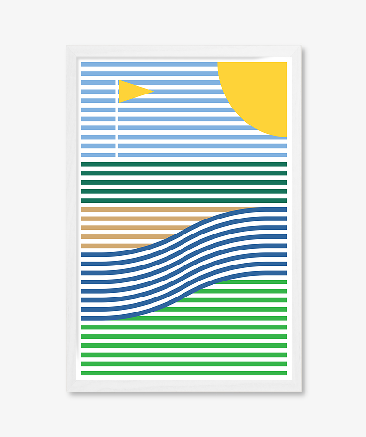 Island Green is a minimalistic design of golf, reduced to its essential lines and colors. Clean, deliberate lines and color define water, bunker, and green - creating a composition that feels calm and quietly expressive.