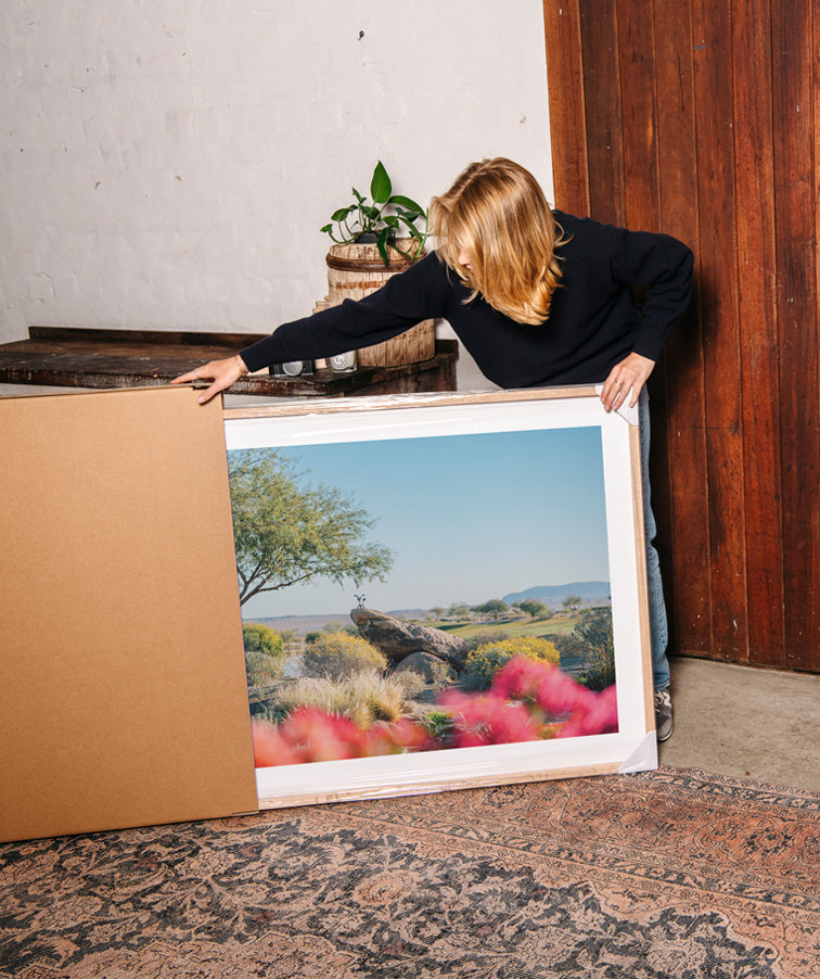 Prints ship rolled in custom protective tubes; framed pieces arrive ready to hang in secure, eco-friendly packaging.
