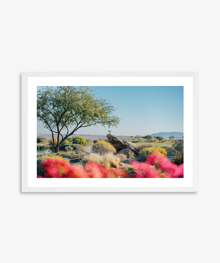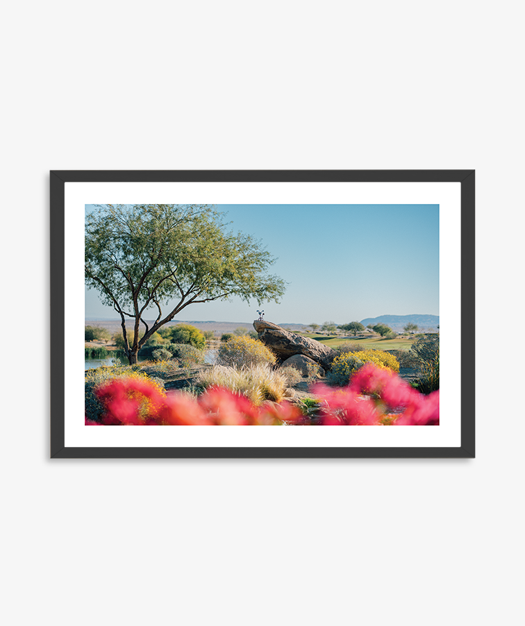 Sun + Bloom reveals a burst of color and life in the heart of the desert - a vibrant oasis where flowers, rock, and fairway harmonize under wide open skies. The scene radiates warmth, stillness, and surprise, capturing the surreal beauty of golf in the desert.