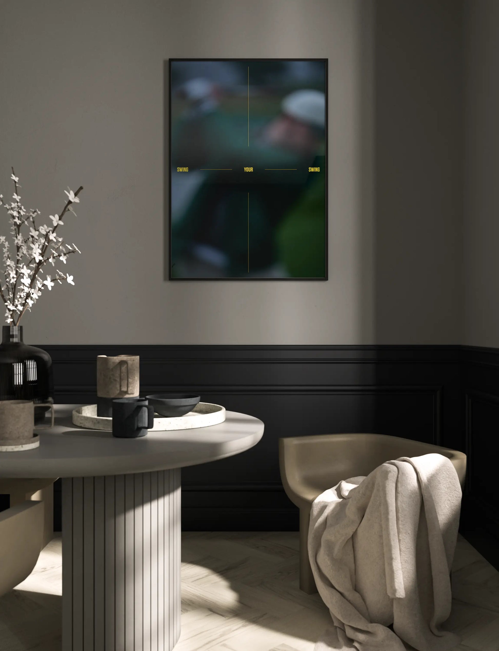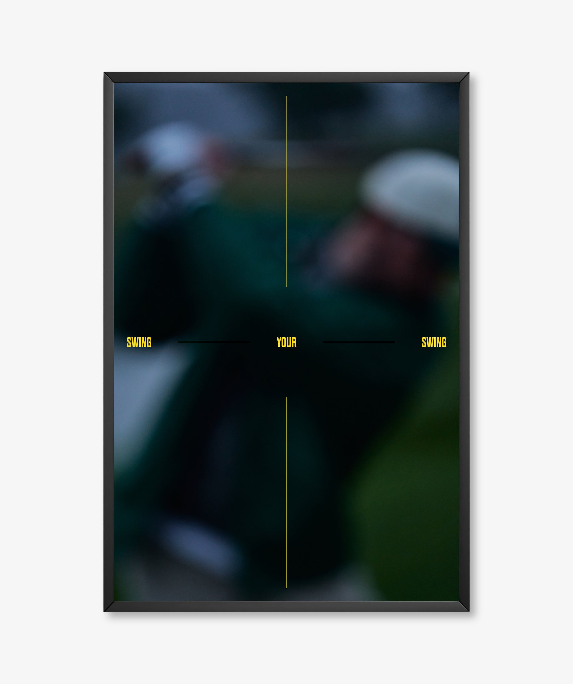 A modern tribute to one of golf’s most empowering mantras, this graphic golf art print features the phrase “Swing Your Swing” in bold typography, layered over a blurred silhouette of a golfer mid-swing. Popularized by Arnold Palmer, it celebrates individuality, confidence, and playing the game your way.